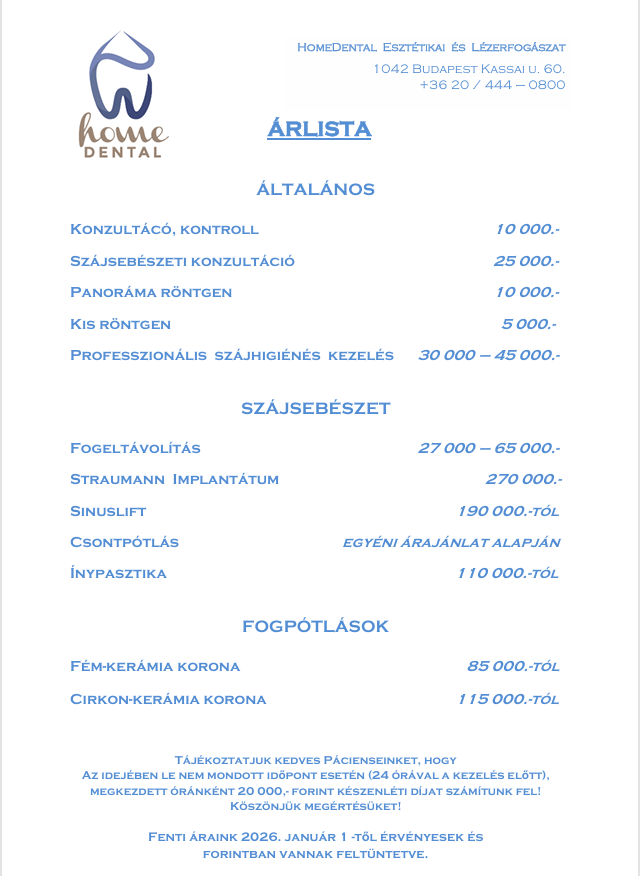 Dr. Marton Rita - Szájsebészeti ellátások árjegyzéke - Érvényes: 2026.01.01 -től!